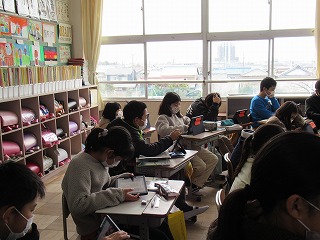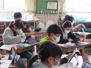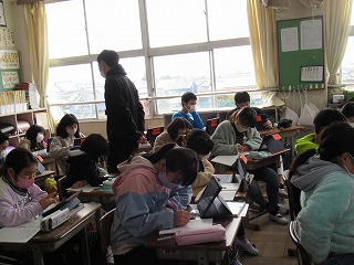 5年2組では、社会科の授業が行われていました。新聞の記事について、タブレットを使い、資料として学習していました。