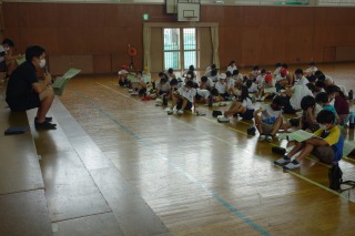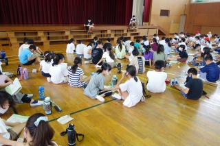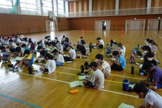 5年1組と5年2組は合同で総合学習を行いました。体育館で野外活動の説明を聞き