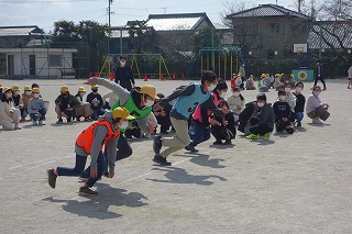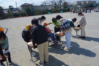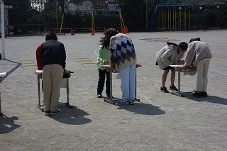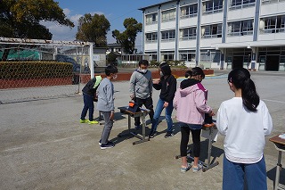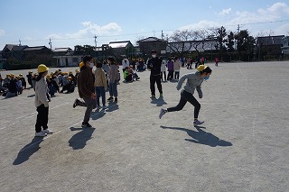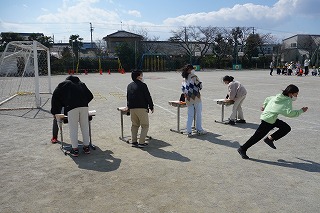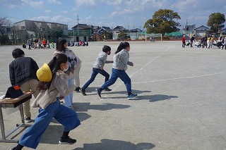 5年生がクイズとリレーを組み合わせた競技を企画し、6年生を招待して勝負しました。体力と知力の両方を競い合いながら、招待された6年生はしっかりと楽しんでいました。