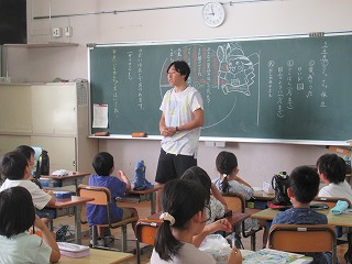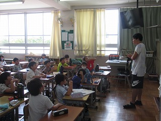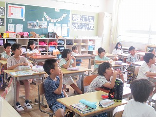 2年2組は朝礼後、教室で防災週間について話をしていました。