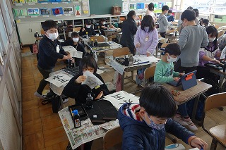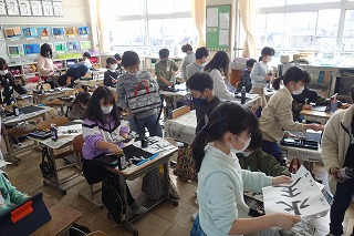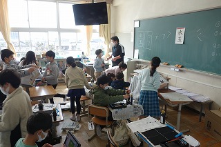 3年2組の書写は毛筆で「水玉」を書きました。習字道具の片付けを整然と行っていました。