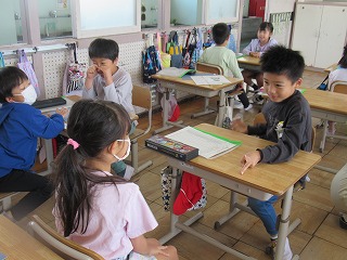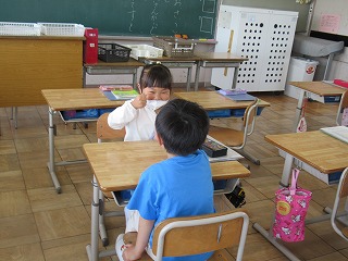 1年1組では、みーわんタイムが行われていました。じゃんけんをしながら、とても楽しそうに取り組んでいました。