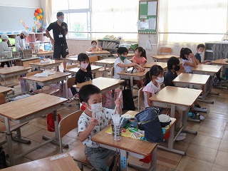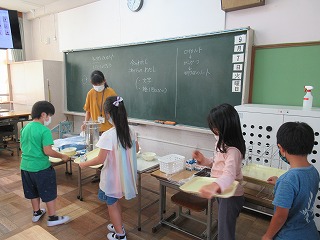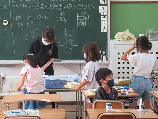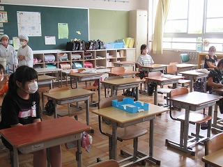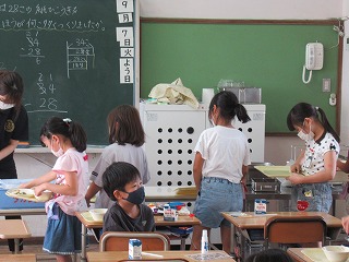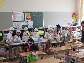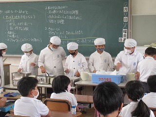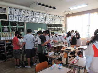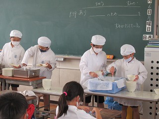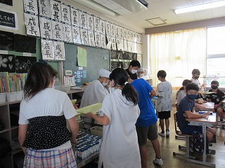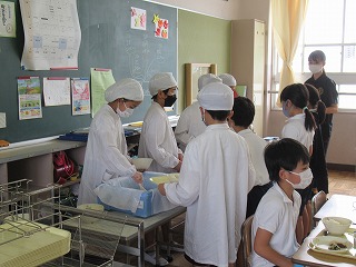 給食の準備のようすです。みんな静かに整列し、順番を待っています。