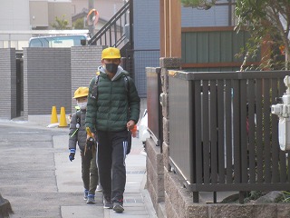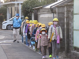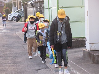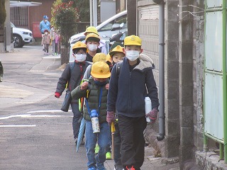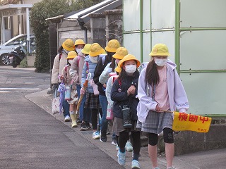 東門の通学班の様子です。見守り隊の方も付き添ってくださっています。安心ですね。ありがとうございます。