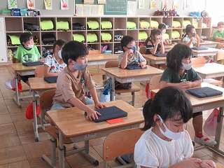 1年2組では、タブレットを使って、学習するところでした。1年生の子どもたちもタブレットの使い方に慣れてきています。