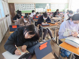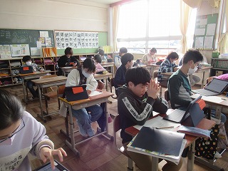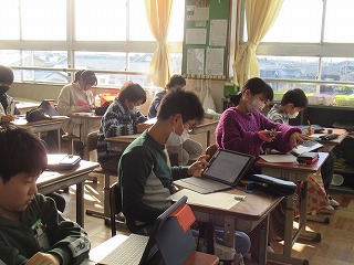 6年1組では、家庭科の授業が行われていました。有機野菜について、調べ学習を行っていました。
