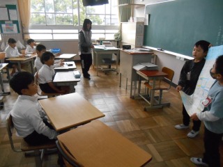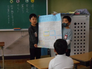 先日行った「おもちゃ祭り」のお礼に1年1組の代表児童が、2年1組の教室にやってきました。お礼の手紙を貼ったものを持ってきてくれました。2年生の表情を見ると、感謝の気持ちが伝わったようです。