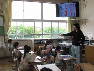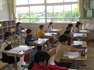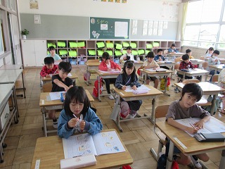 1年1組は国語の時間でした。平仮名の練習に取り組んでいました。姿勢を正すおまじないを唱えながら、みんなで姿勢良く取り組んでいました。