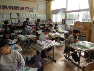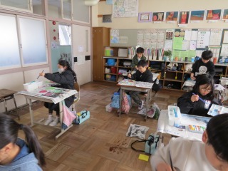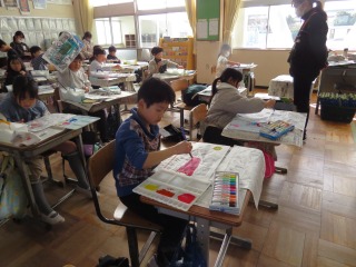 先週画用紙に刷った版画に、今日は色を付けていました。様々な模様を生かした作品を作ります。出来上がりが楽しみです。