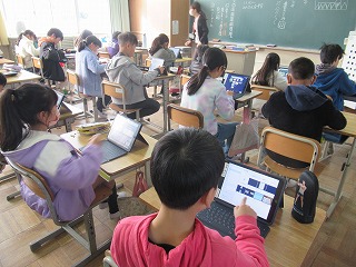 4年2組は、作品展示の作品を片付けた後、自分たちでタブレット学習を行っていました。日本地図パズルを組み立てたり、速算にチャレンジしたりと、自分に合った課題に取り組んでいました。