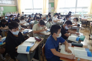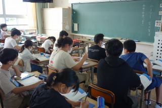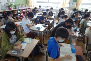 6年1組の国語は、「やまなし」の学習に入りました。教科書を見ながらCDの範読を聞きました。