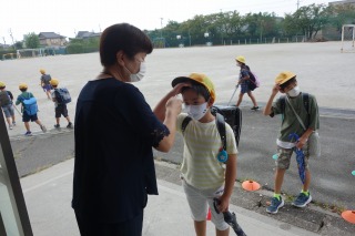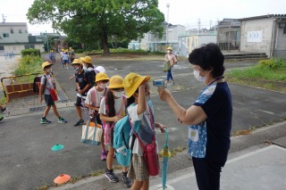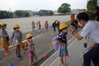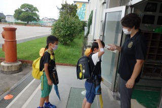 コロナウイルス感染拡大防止対策として、今日も昇降口で検温を行いました。昨日の経験から、ポイントを目安にして子どもたちは静かに並んでいました。