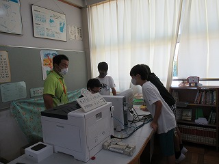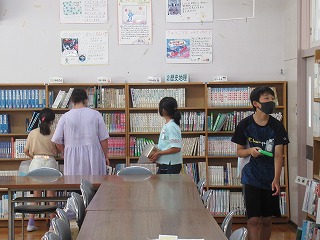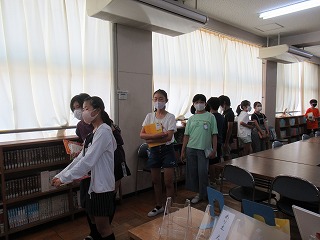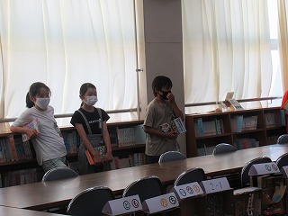 6年1組が、朝の時間を使って、本の貸し出しを行っていました。長い夏休みが始まります。読書に親しんでくださいね。