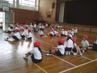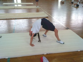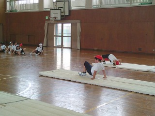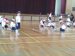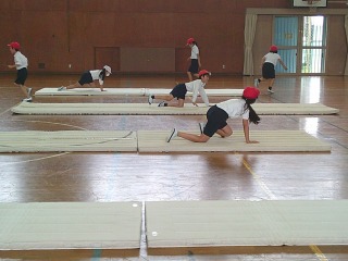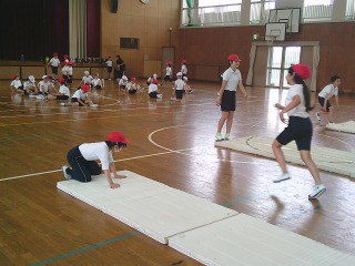 マット運動を行っていました。四つん這いになって進んだり、後ろ向きに手足を使って進んだり、中にはブリッジで後ろへ進む子もいました。体を思ったように動かす練習ですね。