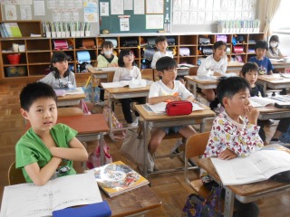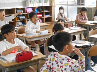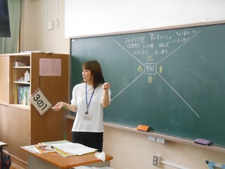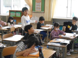学校の周りにはどんな建物があるか、方角を覚えながら発表していました。
