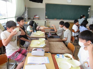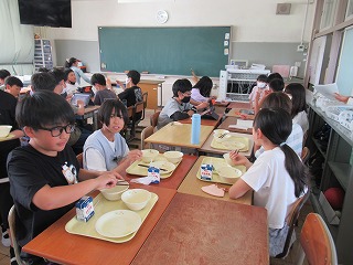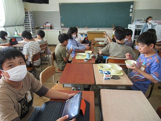 6年2組の給食の時間です。みんな楽しくお話をしながら食べています。早く食べ終わった子は、自分の席で取り組めることを考えて、取り組んでいました。