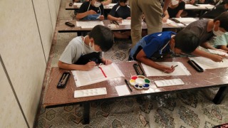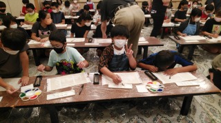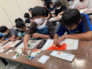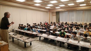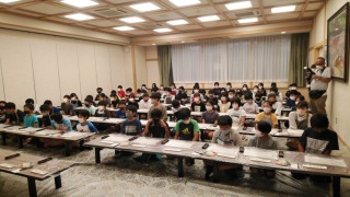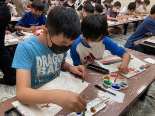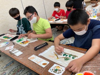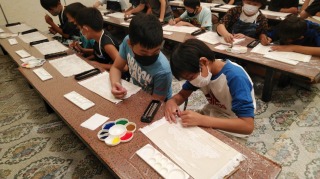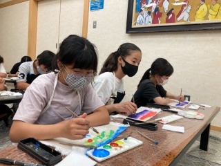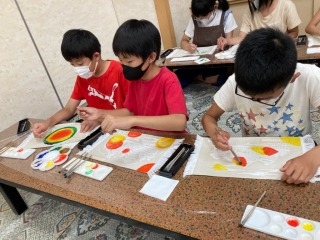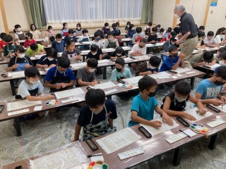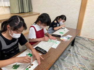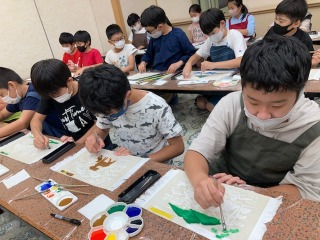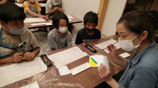夕食後には、2階の集会場で、講師の先生から友禅染を教えていただきました。説明をよく聞いて制作に挑戦しました。