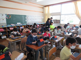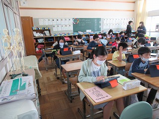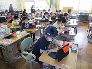 4年1組では、タブレットを使い、調べ学習をしていました。