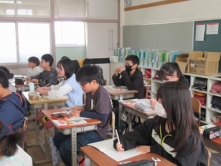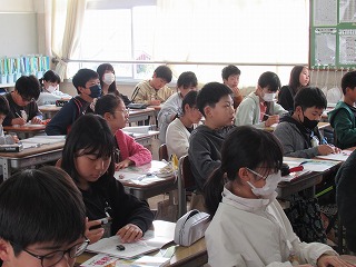 6年2組は算数の時間でした。対称の図形の単元に入っていました。線対称や点対称など、頭の中で図形を回転させて、対応する線などを考えてきましょう。