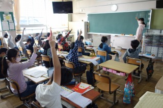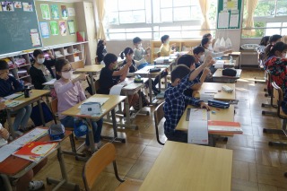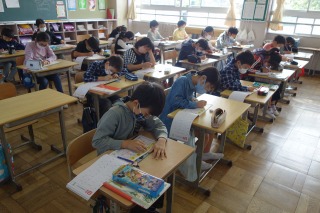4年1組の国語は新出漢字の学習でした。指を使って書き順を確認してから、漢字ドリルに書きました。