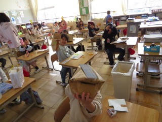 「いっしょにあそぼう ぱくぱっくん」という単元です。廃材を使い、箱のふたや紙袋などがぱくぱくする生き物などを作っていました。