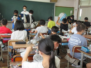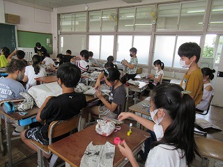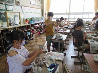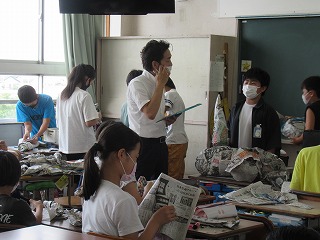 6年2組では、図画工作の授業を行っていました。新聞紙を丸め、形をつくっていきます。何ができあがるのかな?