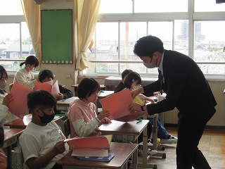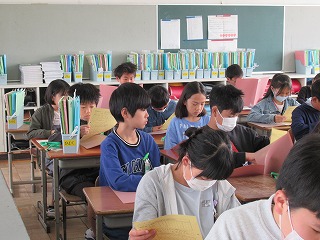 6年1組は始業式後に学年集会を行いました。そこでは、学年目標である『風林火山』の発表と、そこに込められた教師の願いを説明していました。 教室では、学年通信や保健関係の配布物の確認を行っていました。