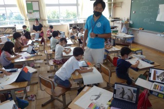1年1組の図工は、「のってみたいな いきたいな」の学習でした。乗ってみたい動物を考えて、絵を描きました。