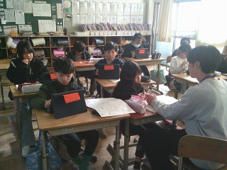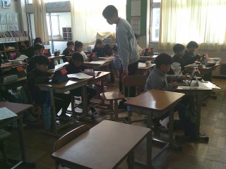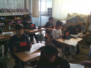 分数の大小を学習していました。分母の違う分数の大小を、数直線を使って考えていました。
