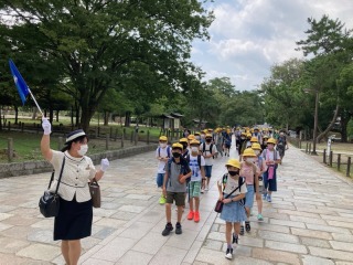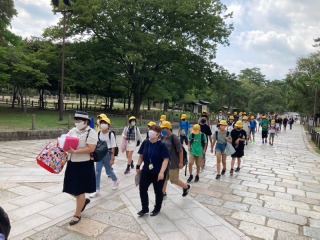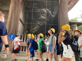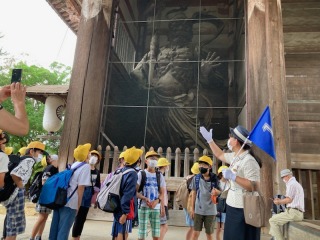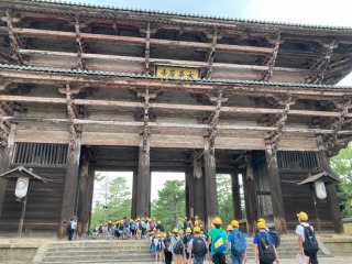 6年生は、奈良の東大寺に到着しました。大きな南大門をくぐって、大仏殿に向かいました。