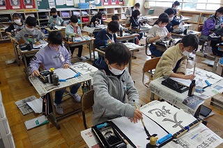 4年2組の書写は、毛筆で「大地」という字を練習しました。