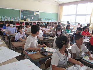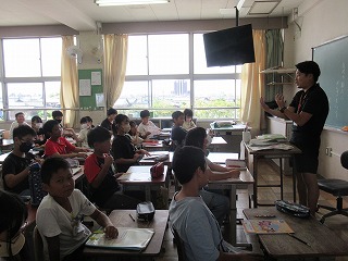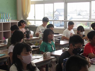 5年1組は朝礼後、教室で担任の丸山先生がお話をしていました。