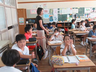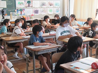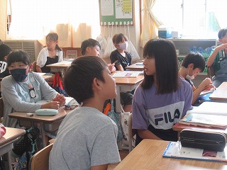 4年2組では、算数の授業が行われていました。わり算についての学習です。となりどうしで相談していました。