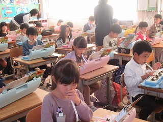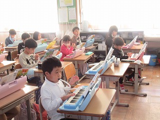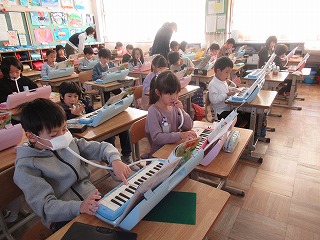 2年2組では、音楽の授業が行われていました。けん盤ハーモニカの演奏を練習していました。