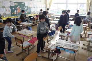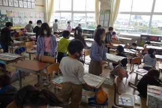 3年1組の図工は、木の絵の着色に取りかかりました。教室いっぱいに机を広げて色を塗る準備をしました。