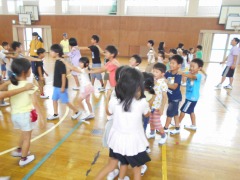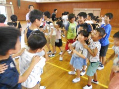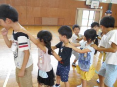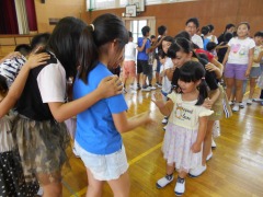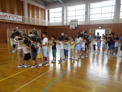昼放課に、異学年交流活動の第2回目を行いました。今日は、1年生と5年生の交流です。「じゃんけん列車」を行いました。児童会役員が見本を見せました。