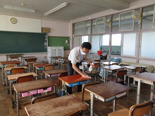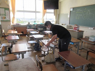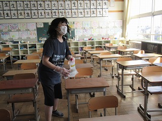 今日も、先生方が、机・いすの消毒を行ってくれています。また、来週、元気に登校してきてくださいね。