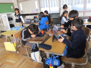 グループに分かれ、愛知県の都市について紹介するスライドを作っていました。どんな作品ができるか楽しみです。