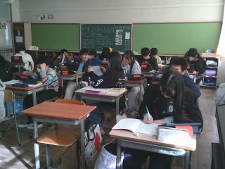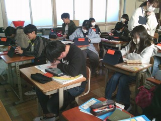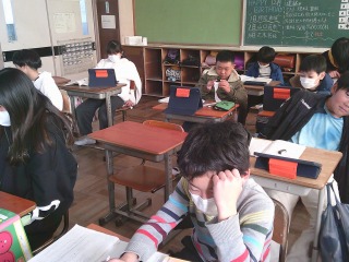 日本文化の魅力を伝える作品をについて、それぞれの気付いたことや感想を書きました。みんなでその文を見ながらどの気付きや感想がよいと思ったか、知らせる活動をしていました。