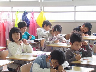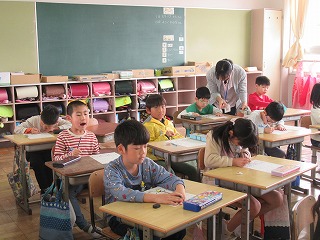 2年1組は、自己紹介のプリントを書いていました。新しく一緒になった友達とも早く仲良くなれるように、自分のことを説明してあげてくださいね。