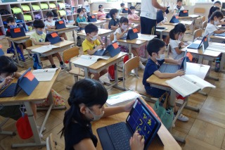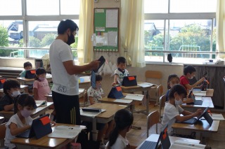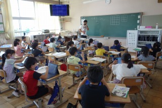 1年1組の総合的な学習は、タブレットの使い方について学びました。ますに文字を書くことで、使い方を覚えました。