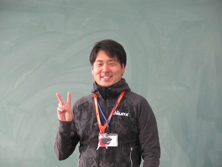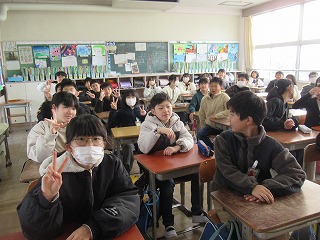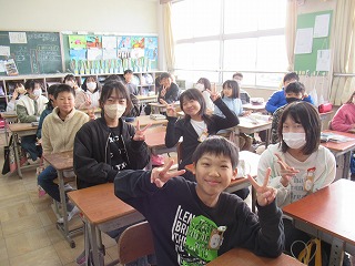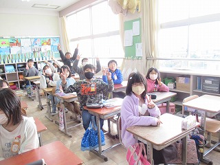 5年1組の朝の会の時間、担任の先生が思わず、にっこりピース。子どもたちもピース。
