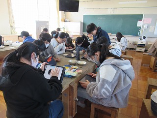 6年2組では、図画工作の時間、コースターづくりをしていました。