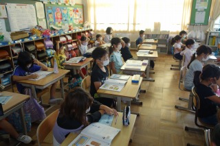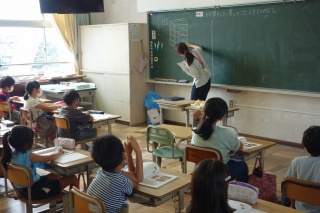 2年1組の算数は、かけ算の学習でした。かけ算の式をみんなで考えました。