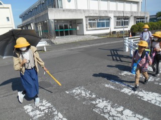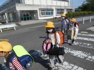 とてもよい陽気の日です。小さい子を見守りながら、上級生が一緒に登校してくれていました。