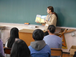 1年2組の先生が読み聞かせをしていました。本の内容に耳を傾け、真剣に聞いていました。