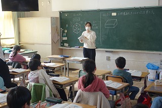 2年1組の算数は、「はこの形」の学習でした。工作用紙を使って箱作りに挑戦しました。