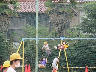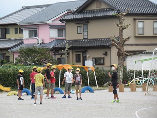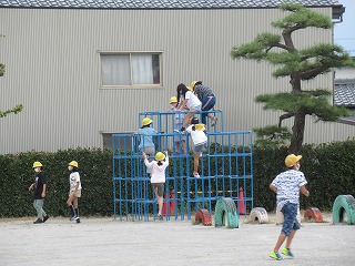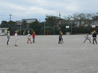 運動場では、曇り空のもと、子どもたちが元気に遊んでいました。