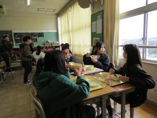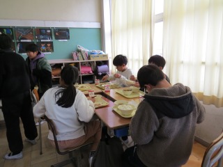 配膳台の前では、増やしてい献立がある子が並んでいました。増やす必要のない子は、静かに食べていました。同じ教室の中での雰囲気の違いに面白さを感じました。
