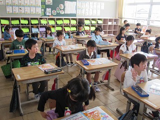 1年2組は国語の時間でした。ひらがなワークを配ってもらい、これから平仮名の練習を行うところでした。書き順も間違えないで覚えられるかな?